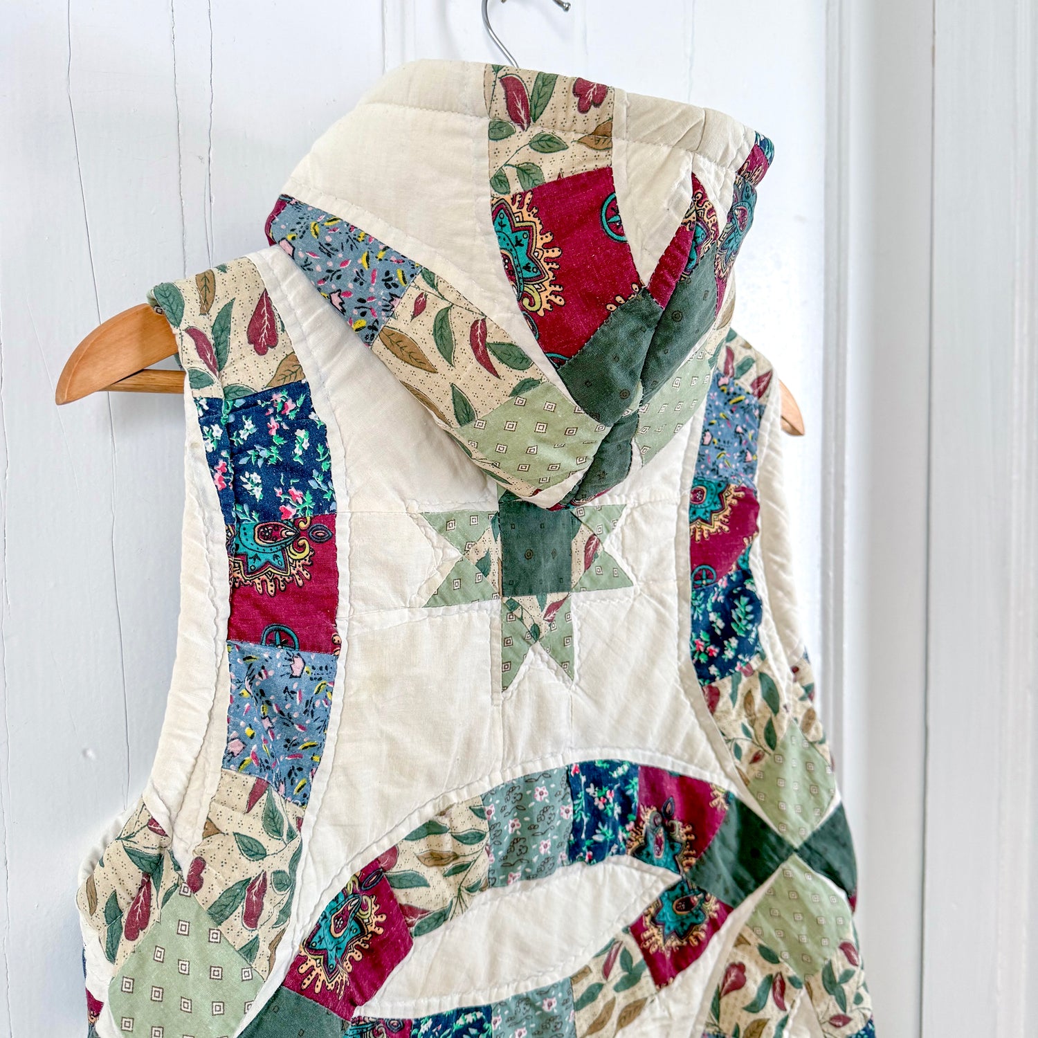 This long hooded vest transforms a treasured vintage quilt into wearable art. Brass snap closures and functional patch pockets enhance its utilitarian charm, while the generous length provides versatile layering through every season. A timeless investment piece that celebrates craftsmanship and sustainable style.